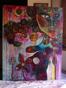 I am in the fifth and final week of Flora Blowley’s first online painting course, Bloom True.  I have wished for and anticipated this class for many months and I was not disappointed.  It was so well thought out, organized and very professionally done with videos of her painting and demonstrating the techniques every week.  I learned so much and I had an interesting  time learning her very freeing way to paint using intuition as my guide.  I have another canvas in the works that isn’t complete yet, but this one is the large 4′ X 5′ stretched canvas that has me feeling very proud and pleased in what I have accomplished.  I can’t wait to begin more canvases using her techniques while spinning my own style within them.