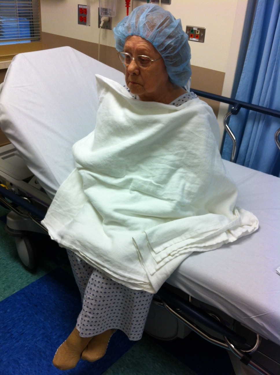 I impulsively took this photo of my mom just before they took her into heart surgery. It is the last photo of her able to sit up and fairly normal. She never recovered and was unable to sit up or walk again.