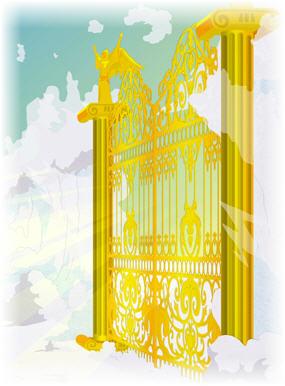 When he was standing before it, he saw a magnificent gate in the arch that looked like mother-of-pearl, and the street that led to the gate looked like pure gold.